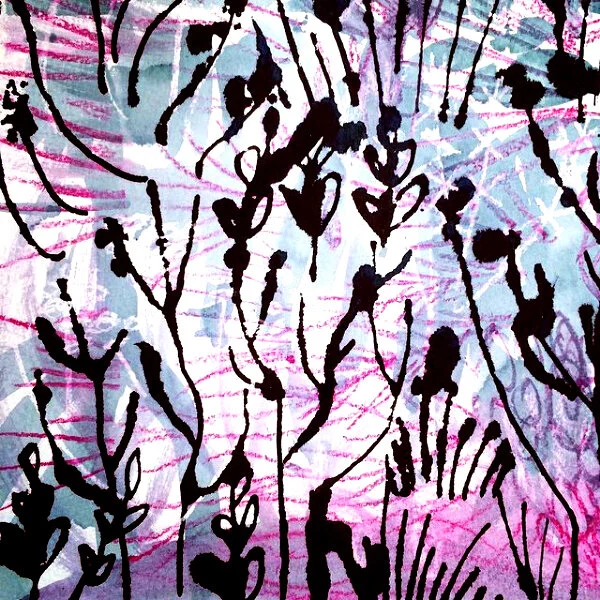 Collage of natural ink offcuts with drawings of fruit tree branches